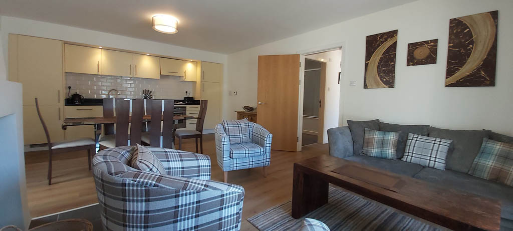 with a real log fire (wood burning stove) to keep you cosy in the winter months. There is also TV with free view. Comfortable seating in the lounge and spacious dining area with space for 4 guests.