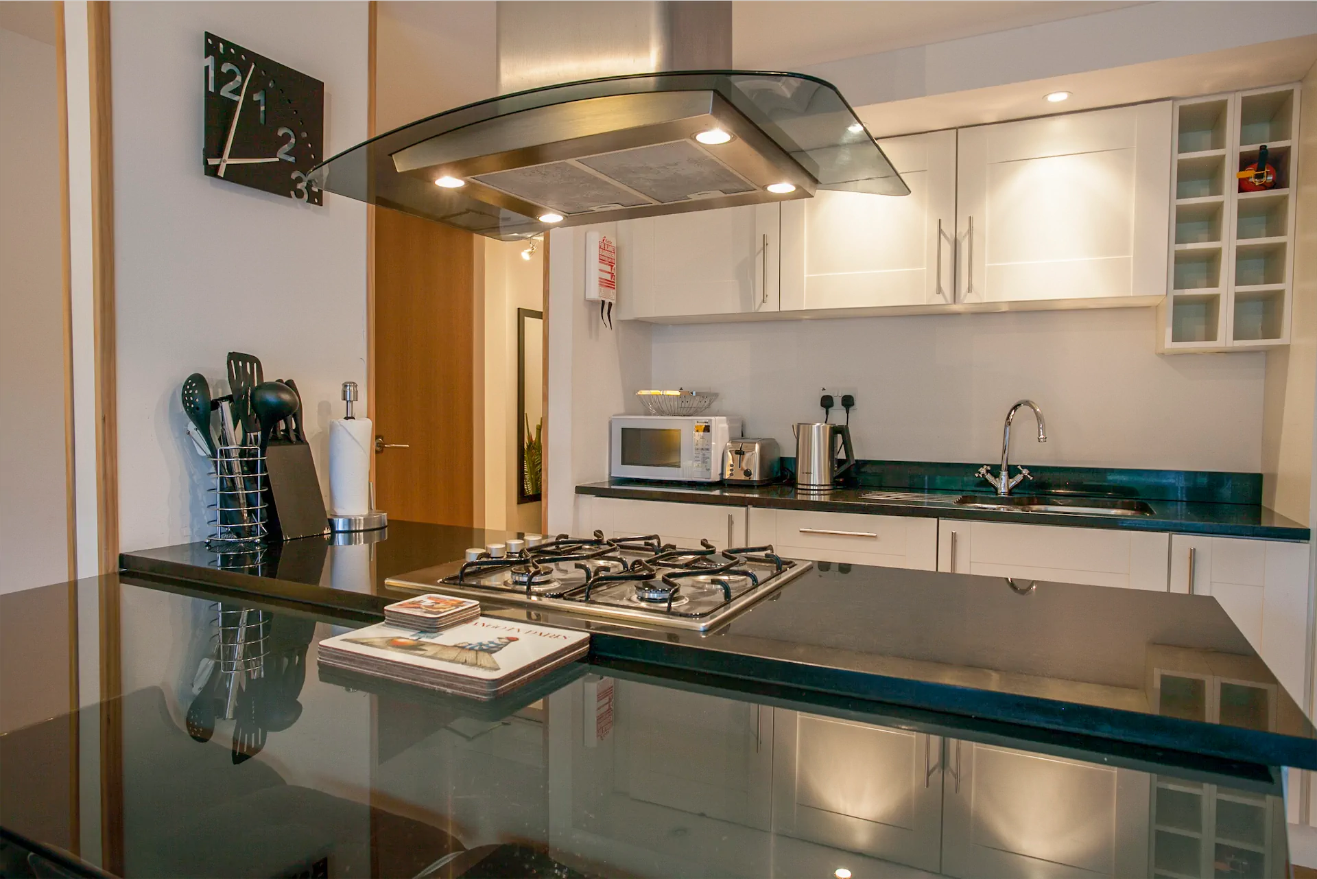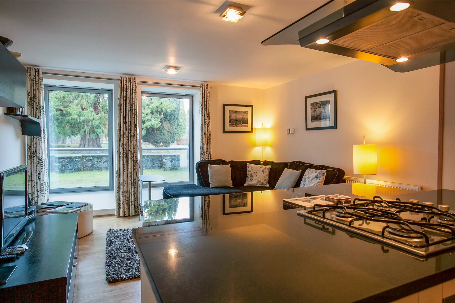 Kitchen fitted with cooker, hob, fridge freezer, dishwasher, washing machine and dryer and granite work tops. Top specification utensils and kitchen equipment. There is a breakfast bar with seating for four and a comfortable lounge area with two full length windows. From here, you have views to the tennis court, Caledonian Canal and the spectacular mountains beyond.