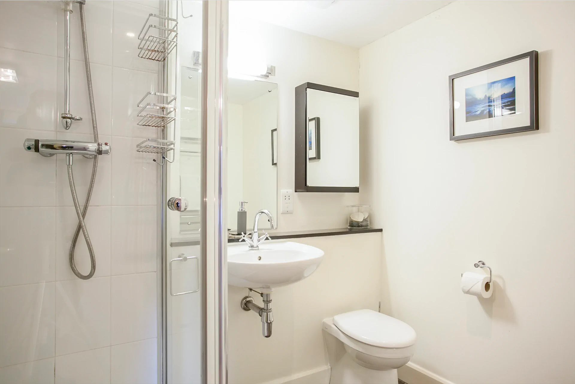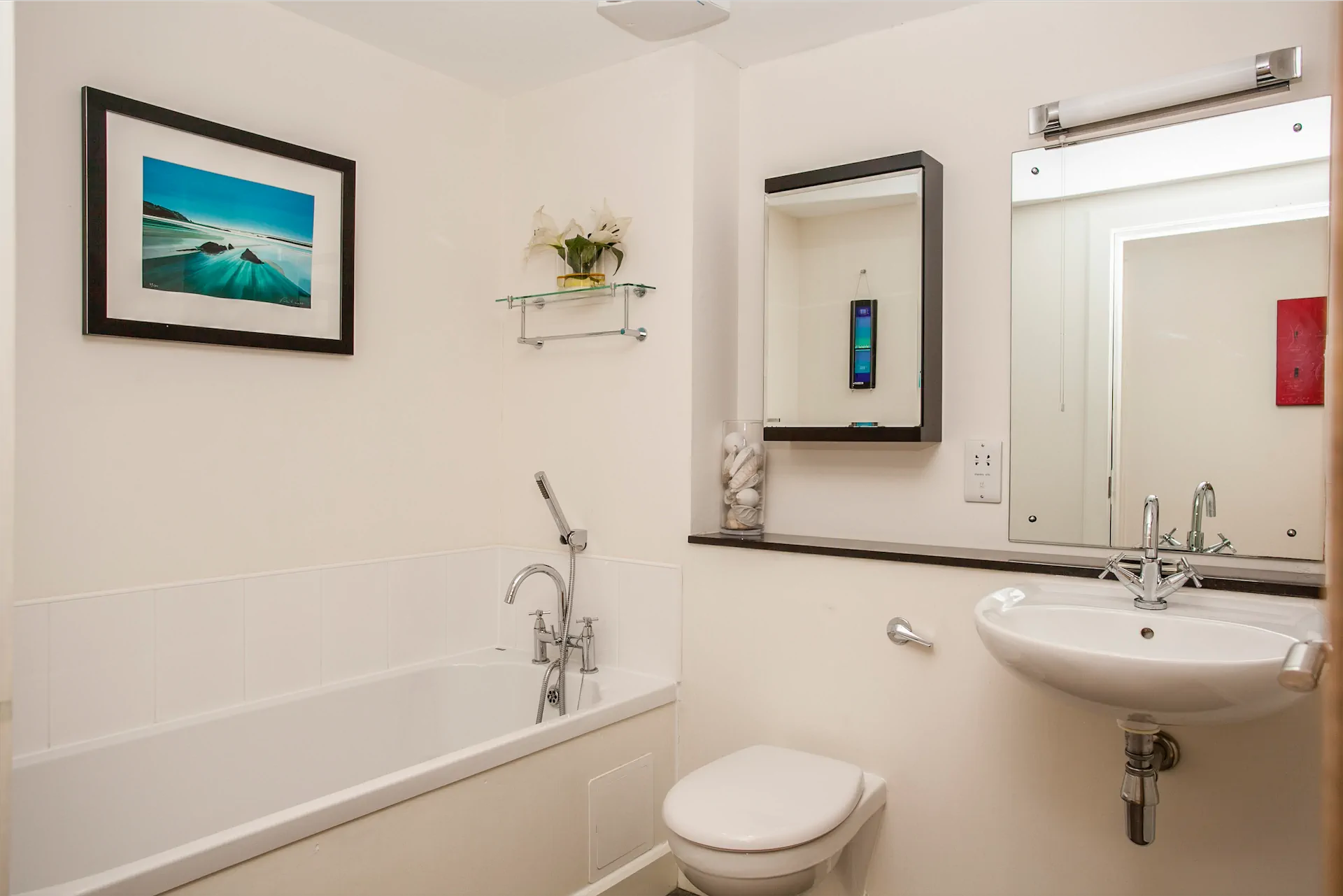 Another stylish double bedroom with spacious mirrored wardrobe, chest of drawers and hairdryer. Another bathroom is just across the hall from the 2nd bedroom.