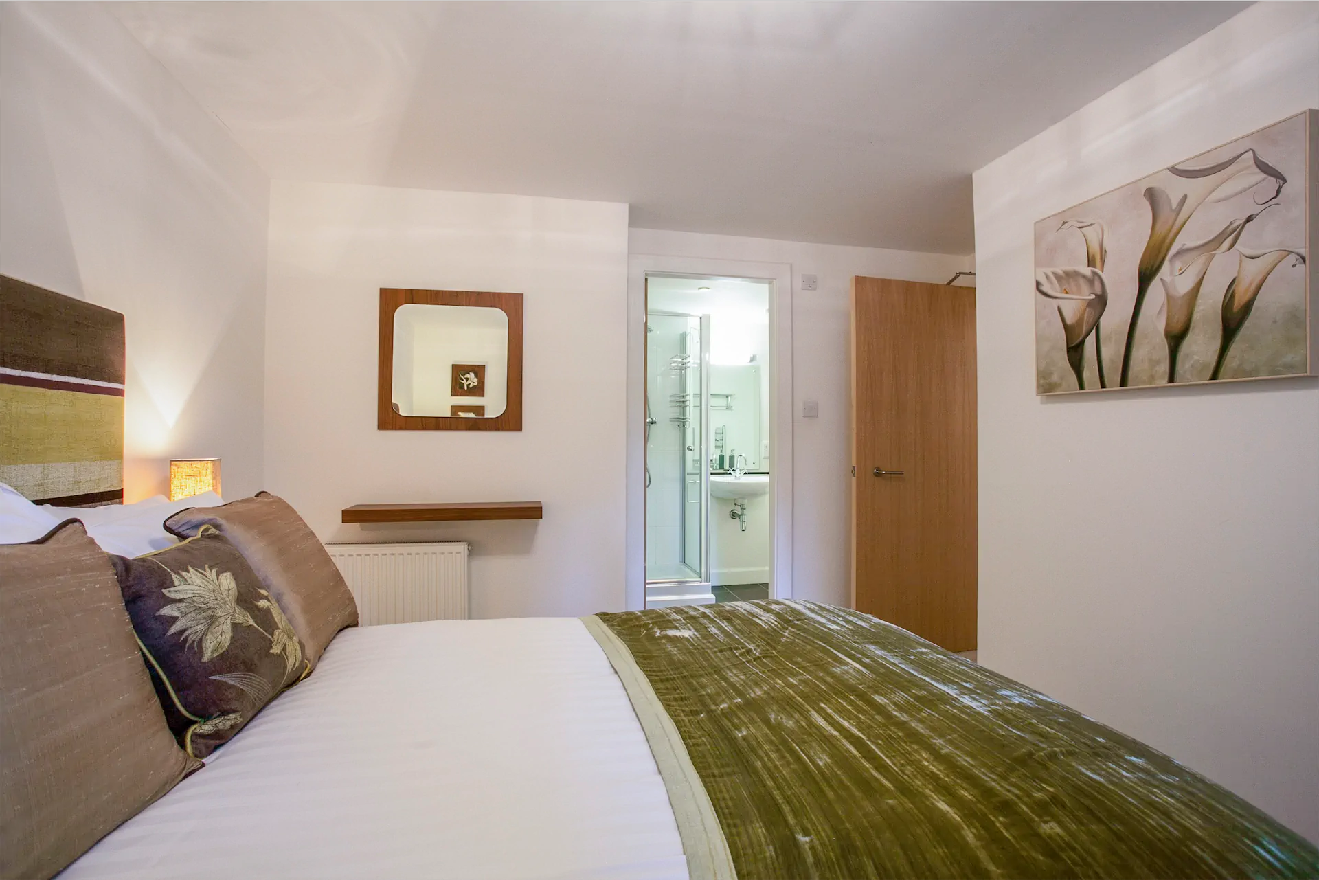 Stylish double bedroom, with clock radio, hairdryer and spacious mirrored wardrobe and chest of drawers. There is an en-suite shower room leading from the master bedroom.