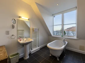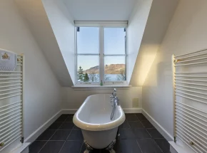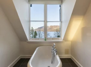 chill out and relax in this bright room with a chunky freestanding period style bath and views out across the waters of Loch Ness and the Hills of Glen Doe Estate.