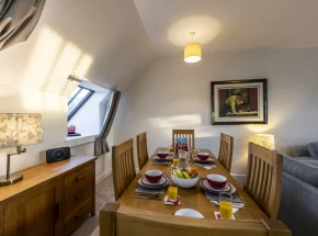 carpeted area with two comfortable sofas, large 40” Flat Screen TV, DVD/CD player, a selection of DVDs for your enjoyment. A solid dining table that seats six people. Four windows give views over Loch Ness and the beautiful architecture of the old Abbey whislt allowing the light to flood in, the sloping roof adds even more to the character of this apartment. Artwork and paintings throughout.
